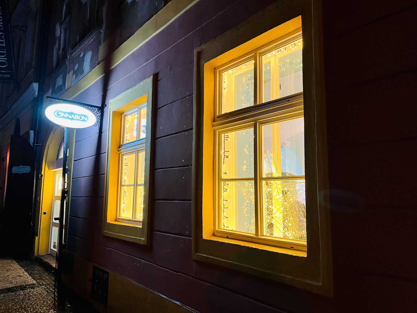Окна Cinnabon на Dlouhá выходят прямо на улицу, благодаря чему в зале много естественного света.