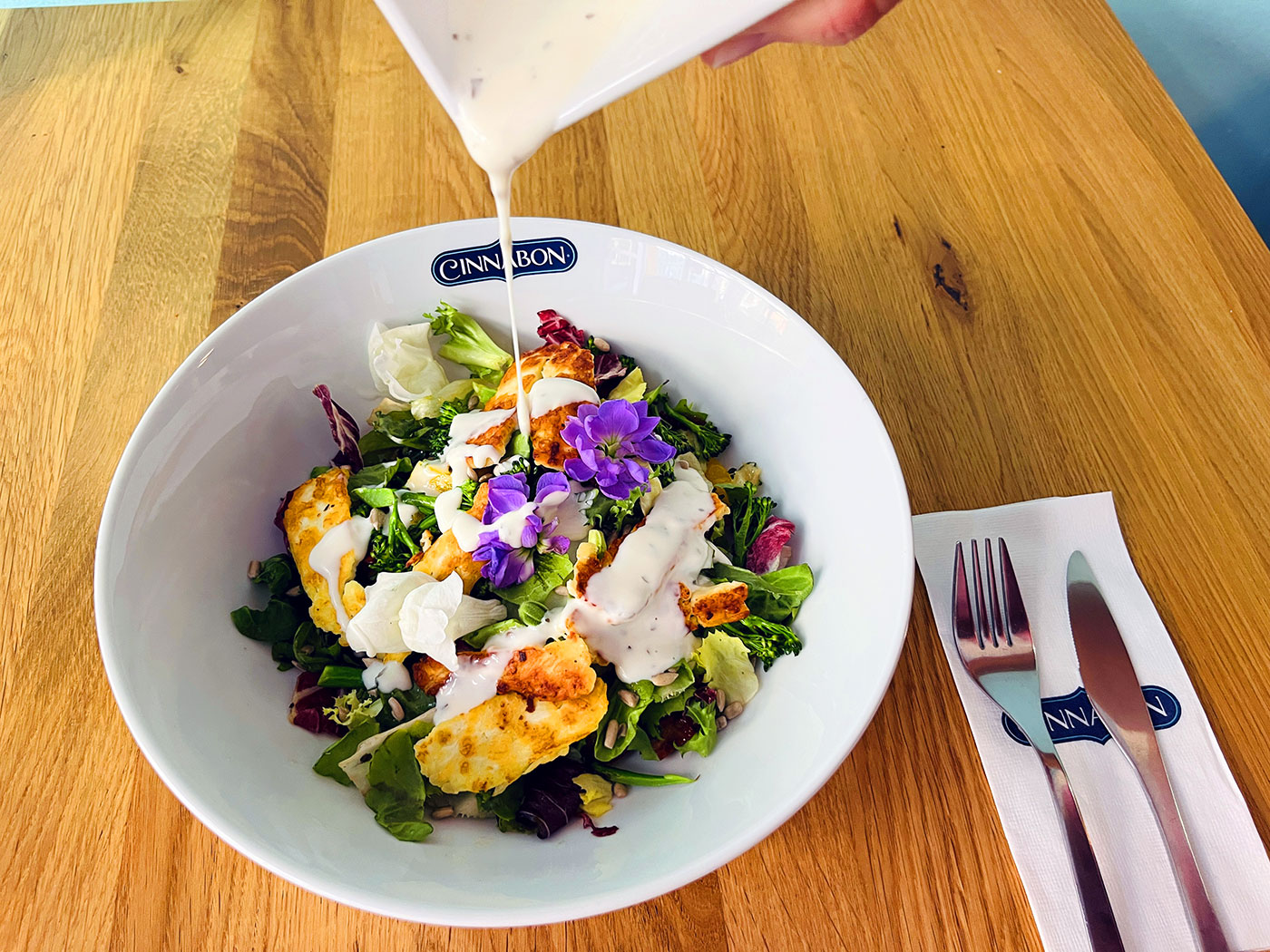 Новинка сезона – салат Grilled Halloumi Salad (соус манго-чили, паприка, вяленые томаты, кедровые орешки, цветы базилика, жареный на гриле кипрский сыр халлуми, смесь салатов, молодая брокколи).
