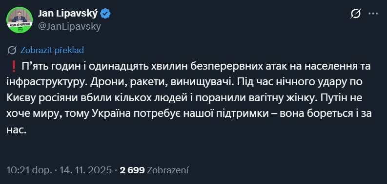 В пятницу, 14 ноября, министр иностранных дел Чехии Ян Липавский прокомментировал массированный удар российской армии по Киеву. Город атаковали ракетами и беспилотниками.