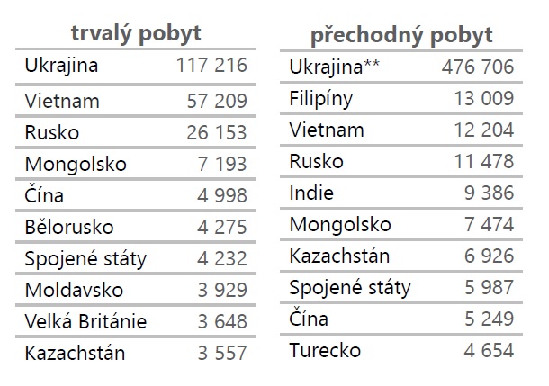 Из общего числа иностранцев 327 214 человек находились в Чехии на основании так называемого переходного/временного пребывания (přechodný pobyt). Это понятие включает в себя долгосрочную визу свыше 90 дней и разрешение на долговременное пребывание (dlouhodobý pobyt он же ВНЖ).