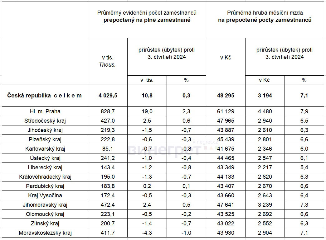 Численность трудоустроенных жителей и средняя зарплата в отдельных регионах Чехии в третьем квартале 2025 года: