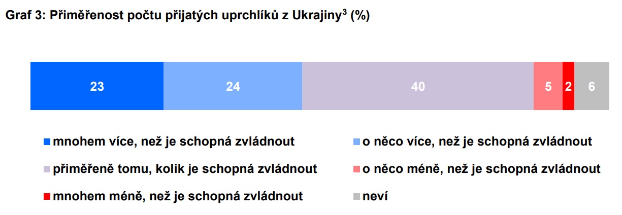 В рамках следующего вопроса участников попросили оценить степень нагрузки на Чехию в плане приема беженцев – приняла она их больше, чем позволяют ее возможности, соразмерно или же меньше.